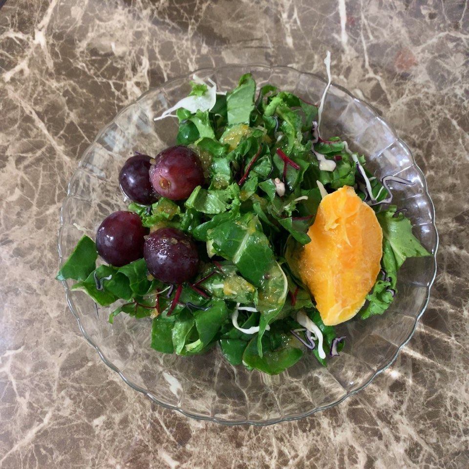 저녁은 오렌지와 거봉이 토핑으로 올라가는 신선샐러드!(feat.유자드레싱)