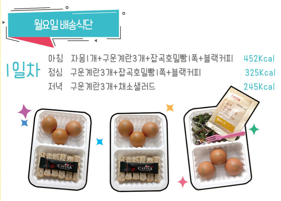 아침, 점심, 저녁 모두 계란이 3개씩 들어있어서 포만감이 상당했어요.
